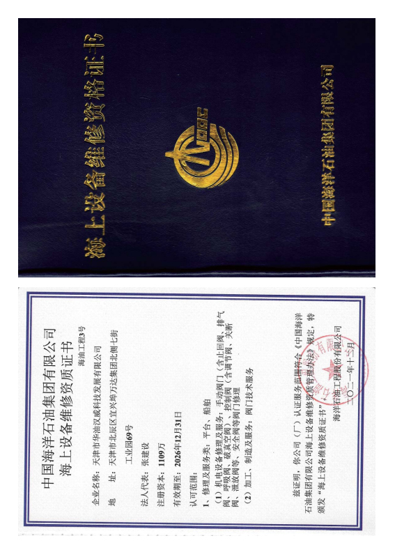 中海油海上設(shè)備維修資質(zhì)證書(shū)